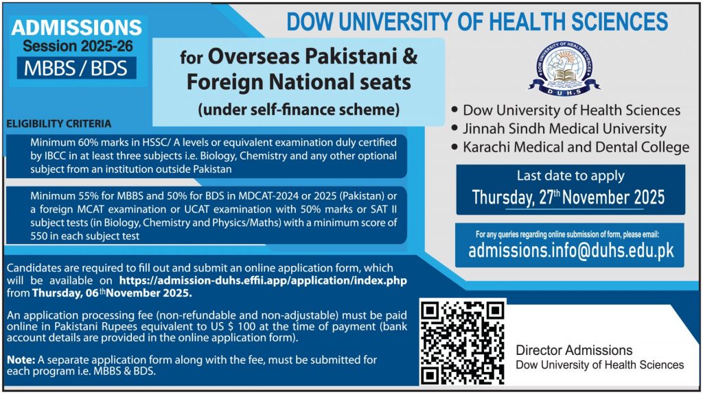 Applicant Portal link of OAS: https://admission-duhs.effii.app/application/index.phpOnline application form will be available w.e.f. from September 21, 2024