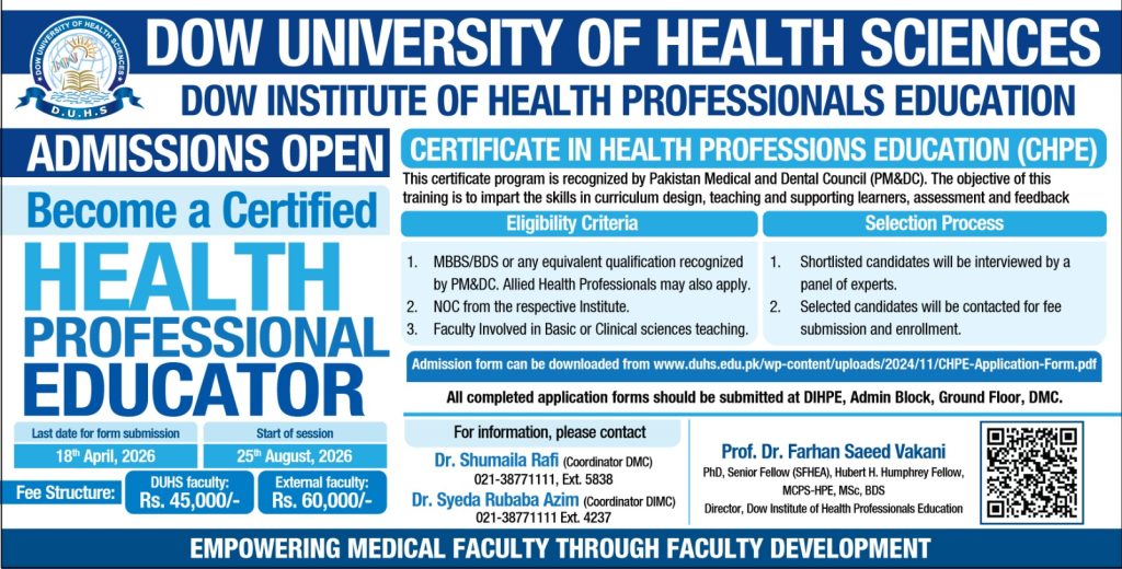 “Embark on a transformative journey by enrolling in the Certificate in Health Professions Education (CHPE) program, offered by the Dow Institute of Health Professionals Education (DIHPE) at Dow University of Health Sciences.
