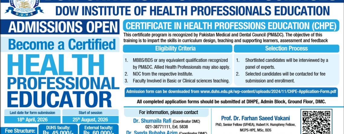 “Embark on a transformative journey by enrolling in the Certificate in Health Professions Education (CHPE) program, offered by the Dow Institute of Health Professionals Education (DIHPE) at Dow University of Health Sciences.