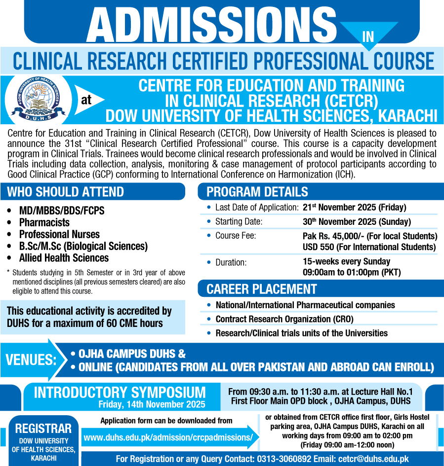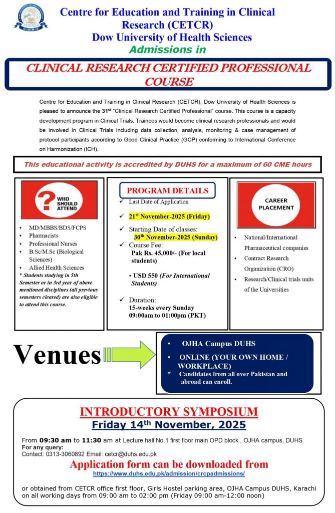 CLINICAL RESEARCH CERTIFIED PROFESSIONAL (CRCP) COURSE ADMISSION