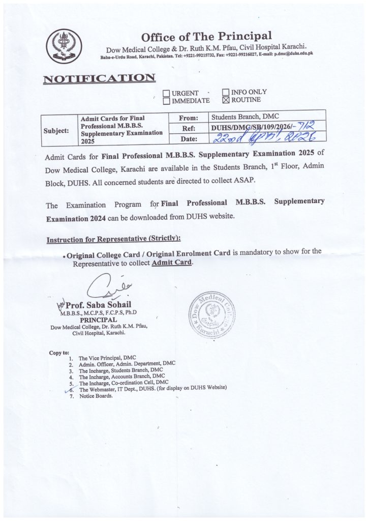Admit Card for Final M.B.B.S Professional Supplementary Examination 2025