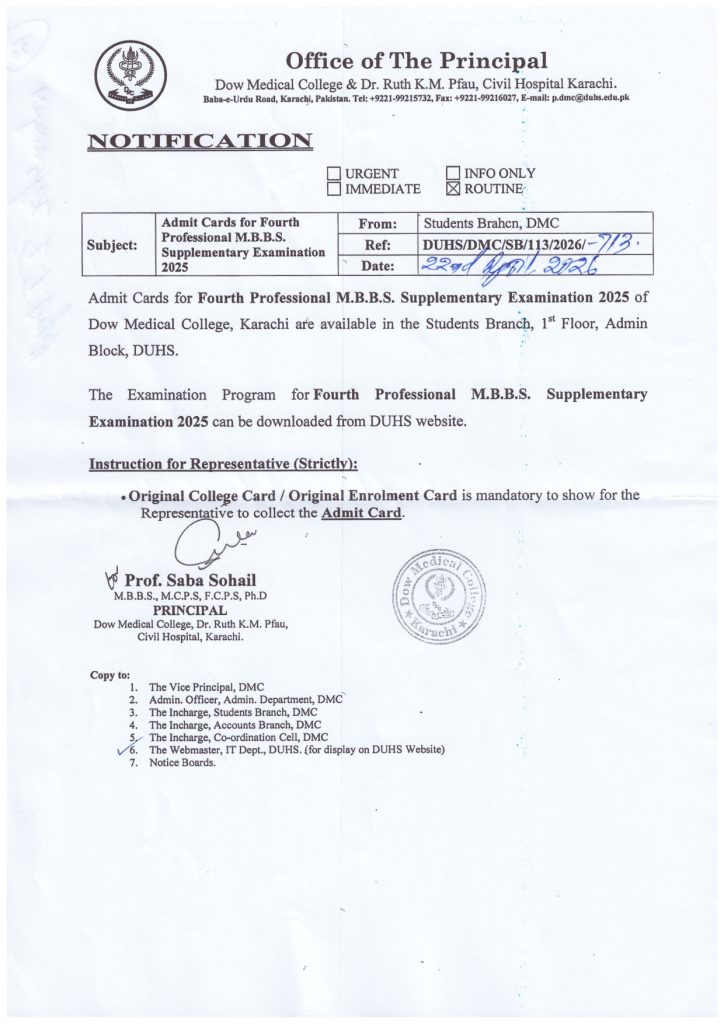 Admit Card for Fourth M.B.B.S Professional Supplementary Examination 2025