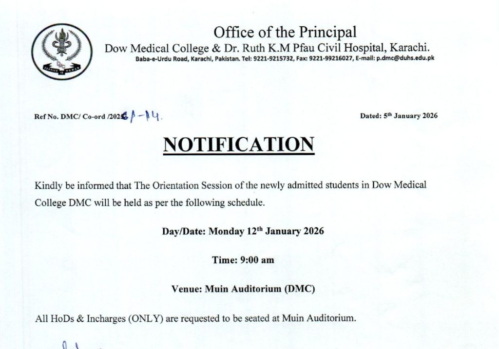 Notification for Orientation Day – Dow Medical College