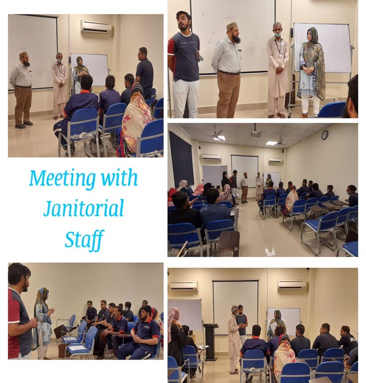 The session was conducted by Ms. Yasmeen, Coordinator Green Youth Movement Club. The main objective of conducting the session was to equip each janitorial staff with the ins and outs of waste. They were provided with complete guidelines on waste reduction and its disposal which subsequently sparked their interest in the activities. Green and Blue Color codes were used to segregate the recycling (Green) & non-recyclable (Blue) wastes.
