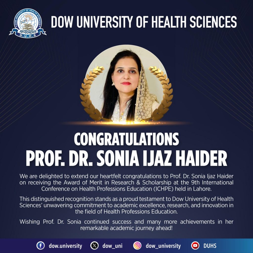 Dow University of Health Sciences proudly congratulates Prof. Dr. Sonia Ijaz Haider on receiving the Award of Merit in Research & Scholarship at the 9th International Conference on Health Professions Education (ICHPE) held in Lahore.