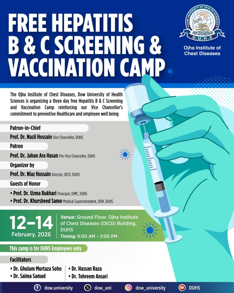 The Ojha Institute of Chest Diseases, Dow University of Health Sciences, is organizing a 3-day Free Hepatitis B & C Screening and Vaccination Camp to promote preventive healthcare and employee well-being.